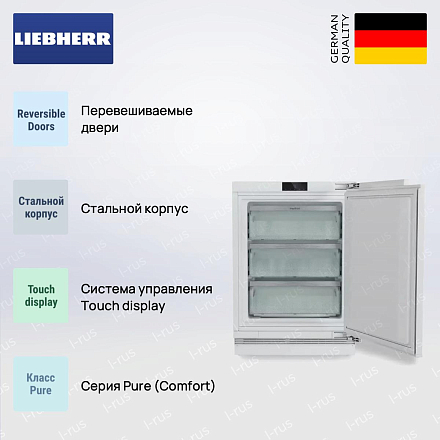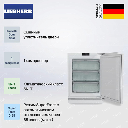 Встраиваемая морозильная камера Liebherr SUFC 3703 сочетает компактность и функциональность для современной кухни. Это встраиваемое устройство серии Pure класса Pure (Comfort) создано в Австрии и поставляется с гарантией 2 года, что подтверждает надежность конструкции и комплектующих. Корпус и дверца выполнены из стали, а скрытая ручка и аккуратная лицевяя поверхность позволяют органично интегрировать прибор в интерьер, устанавливая его под столешницу или в нишу со стандартными размерами 86–92×60×56 см. Монтаж по системе Door-on-door обеспечивает жесткое крепление фасада весом до 10 кг, а возможность перевешивания дверцы и смены уплотнителя добавляют гибкости при установке.