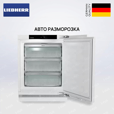 Liebherr SUFND 365i — встраиваемая морозильная камера, сочетающая продуманный дизайн и надежные технологии для комфортной повседневной эксплуатации. Корпус и дверь выполнены из стали с элегантной скрытой ручкой, что обеспечивает строгую и лаконичную внешность при встраивании под столешницу; жесткое крепление двери по системе Door-on-door позволяет ровно интегрировать фасад до 10 кг, а возможность перевешивания петли дает гибкость при планировке мебели. Компактные габариты 81,9 х 59,7 х 55,6 см и рекомендованные размеры ниши 82–88 х 60 х 56 см делают агрегат подходящим для большинства кухонных модулей, при этом вентиляция осуществляется через цоколь, а регулировка ножек обеспечивает точную подгонку по высоте.