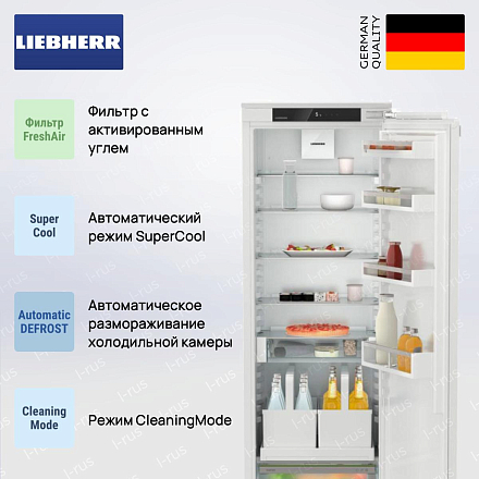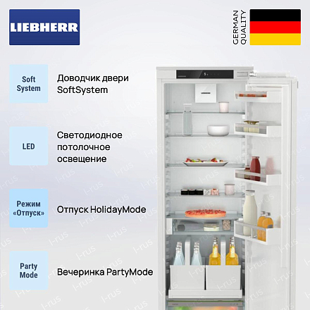Встраиваемый холодильник Liebherr IRDe 5120 состоит из одной камеры. Морозилка не предусмотрена. Вы можете смонтировать его рядом с морозилкой Либхерр или установить отдельно. Благодаря значительному внутреннему объему и продуманному наполнению, устройство может вместить в себя большое количество разнообразных продуктов. Предусмотрены специальные опции и настройки, которые делают эксплуатацию прибора еще более комфортной.