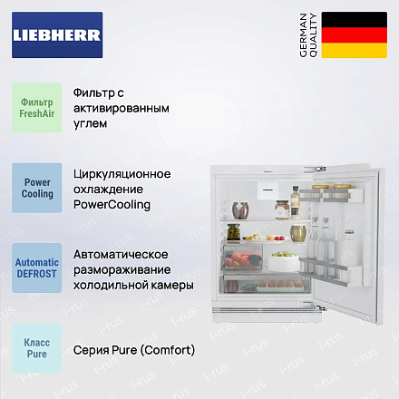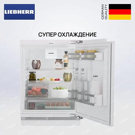 Встраиваемый холодильник Liebherr URC 3700 — компактная встроенная модель без морозильной камеры серии Pure, созданная в Австрии для тех, кто ценит минимализм и продуманную функциональность. Его строгие геометрические пропорции (85.9 х 59.7 х 55.6 см) и система «door on door» позволяют установить прибор заподлицо с фасадом, сохранив единую линию мебели; максимальная масса облицовки до 10 кг делает совместимость с тяжёлыми дверцами простой задачей. Корпус располагается в нише размеров 86–92 х 60 х 56 см, а регулируемые по высоте ножки (4 шт.) и угол открывания 115° упрощают монтаж и доступ к содержимому даже при плотной планировке.