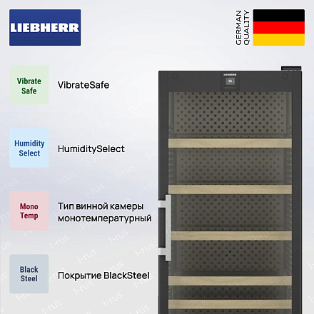 Полки для хранения в винных шкафах Либхер изготовлены из дерева. Это международный стандарт, которого придерживается фирма. У этого решения есть несколько причин. Сам материал выглядит эстетически и позволяет насладиться процессом. Кроме того, в таком оборудовании должна поддерживаться определённая влажность, чтобы пробка не рассохлась. Именно дерево лучше всего на неё реагирует. Рейки, изготовленные вручную, надёжно удерживают бутылки и снижают вибрацию.