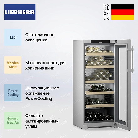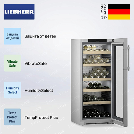 Техника оснащена современной системой циркуляционного охлаждения PowerCooling, обеспечивающей равномерное распределение прохлады по всем уровням, а фильтр из активированного угля поддерживает чистоту воздуха, устраняя посторонние запахи. Система TempProtect Plus стабилизирует климат при кратковременных перегрузках и колебаниях окружающей температуры, что особенно важно для длительной выдержки. Для поддержания оптимальных показателей влажности предусмотрена функция HumiditySelect, корректирующая микроклимат в зависимости от потребностей пробок и содержимого. LED‑подсветка с возможностью плавной регулировки яркости создаёт комфортную экспозицию бутылок, а длительное время работы ламп позволяет демонстрировать коллекцию без ущерба условиям выдержки.